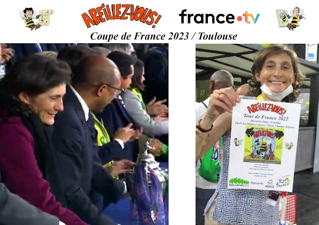 La Ministre des Sports, Amélie Oudéa-Castéra, salue les joueurs nantais et toulousains lors de la finale de la Coupe de France retransmise sur France Télévisions et soutient "Abeillez-vous !"
